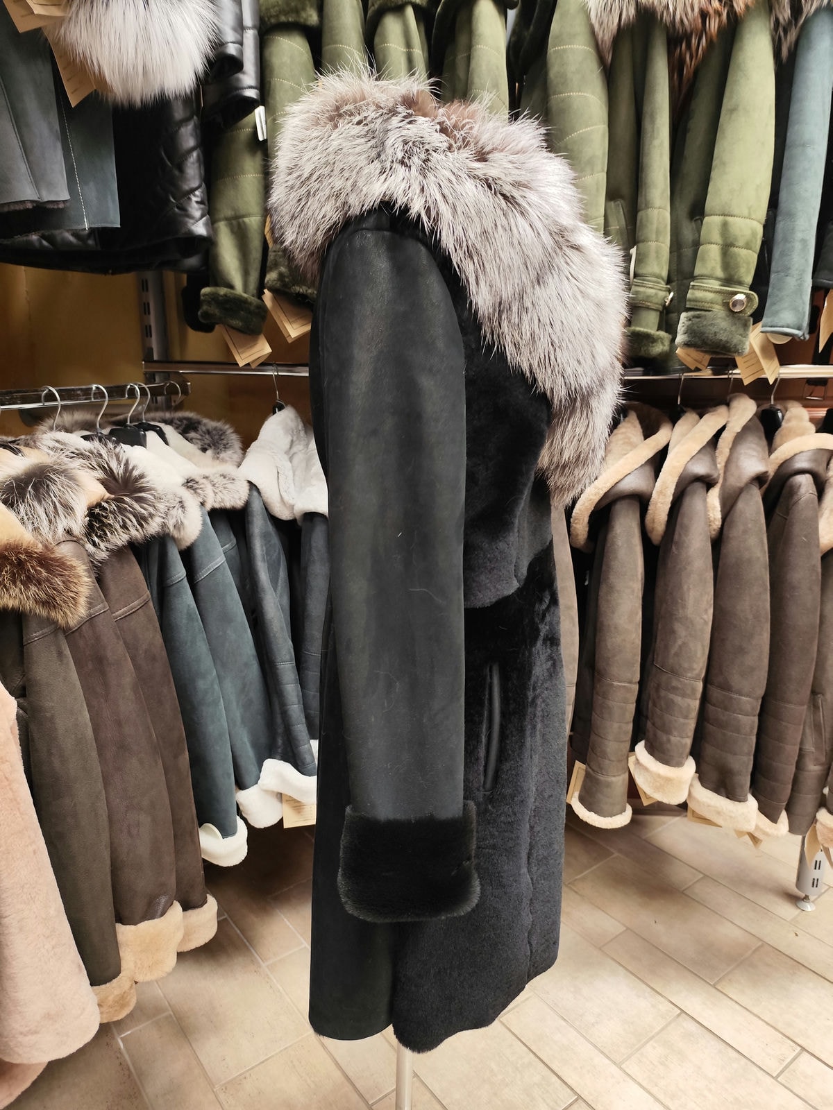 Női kabát bárányirhából, comb középig érő hosszúság, Méret és készlet után érdeklődjön telefonon: 20/972-5227